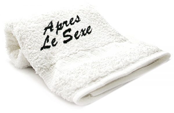 This fun embroidered “apres le sexe” towel is not only a unique and clever gift; it is also a very practical and usable one. embroidered with one of 48 different sexy words or phrases these towels are super absorbent. made in the usa; these 86% cotton and 14% polyester towels measure 27″ x 16″ and are machine washable. shouldn’t you keep at least one handy?
