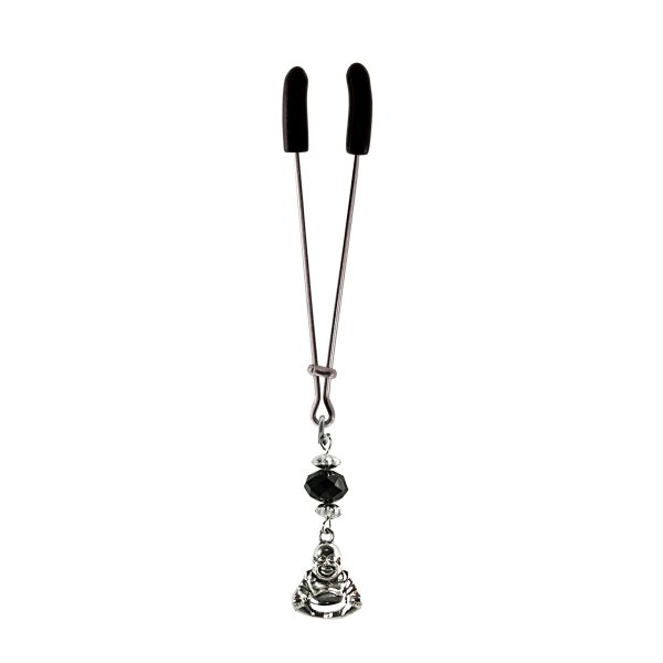 We love this shiny chrome happy buddha charm hanging on a gleaming chrome tweezer style clit clamp. A black faceted bead with silver accents adds glamour. The tweezer clamp is fully adjustable by sliding the bar up or down. includes organza gift storage bag (color will be random) A clit clamp is a simple sex toy designed to gently squeeze the clitoris and provide thrilling arousal without vibrations. Clit clamps are gentle sex toys designed to enhance female sexual pleasure.