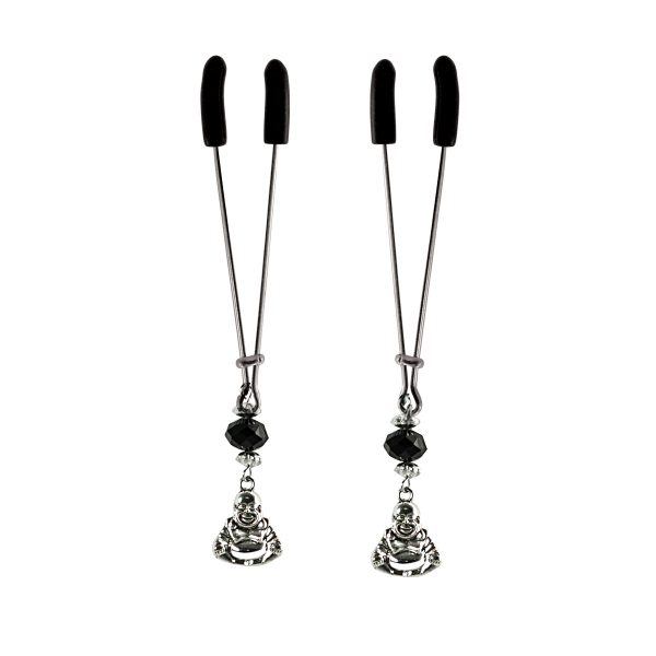 We love these shiny chrome happy buddha charms hanging on gleaming chrome tweezer style nipple clamps. Black faceted beads with silver accents adds glamour. The tweezer clamps are fully adjustable by sliding the bar up or down. includes organza gift storage bag (color will be random)