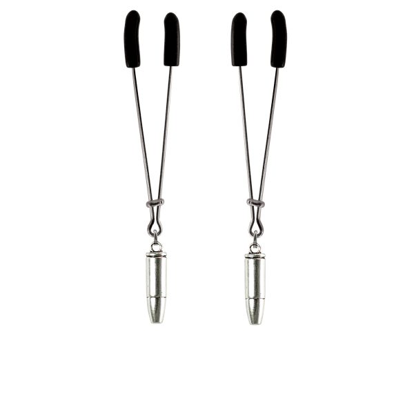 Take your best shot with these hot bullet charms hanging on gleaming chrome tweezer style nipple clamps. The tweezer clamps are fully adjustable by sliding the bar up or down. includes organza gift storage bag (color will be random)