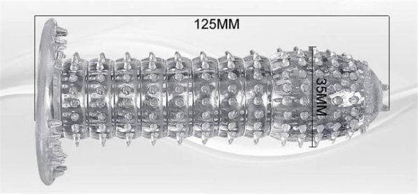 This crystal clear silicone penis sleeve is covered with tiny nubs and ridges which greatly increases stimulation to your partner. It also adds girth to the wearer.