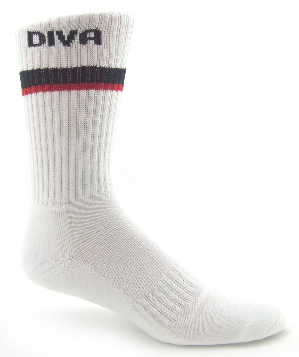 Breathable combed cotton with stretch spandex for strength and flexibility. Non-ravel top. Form-fitting arch construction. Impact-absorbing double cushion sole. 80% cotton, 10% rubbertex, 10% nylon