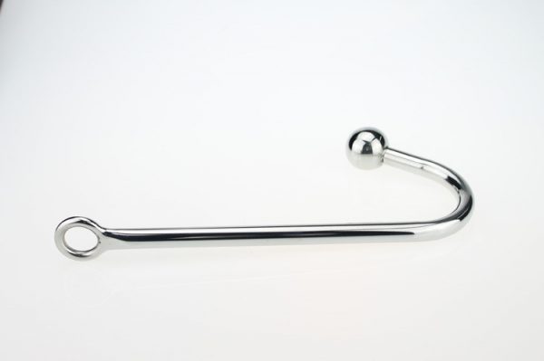 The straight shaft of this stainless steel anal hook measures about 8″. The insertable end with ball measure about 5″. This item is very lighweight (hollow) but will stand up to most play sessions. Stainless steel is all lube compatible and cleans easily with soap and water.