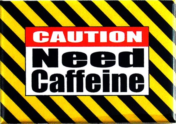 Caution Need Caffeine Magnet. Vibrant colors. Metal with clear mylar coating magnet. 2 x 3″ or 5.08 x 7.62cm. By PHS International.