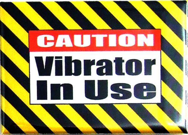 Caution Vibrator in Use Magnet. Vibrant colors. Metal with clear mylar coating magnet. 2 x 3″ or 5.08 x 7.62cm. By PHS International.