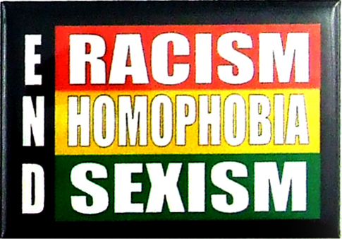 End Racism/Homophobia/Sexism Magnet. Vibrant colors. Metal with clear mylar coating magnet. 2 x 3″ or 5.08 x 7.62cm. By PHS International.