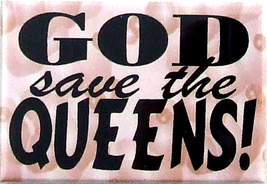 God Save The Queens Magnet. Vibrant colors. Metal with clear mylar coating magnet. 2 x 3″ or 5.08 x 7.62cm. By PHS International.