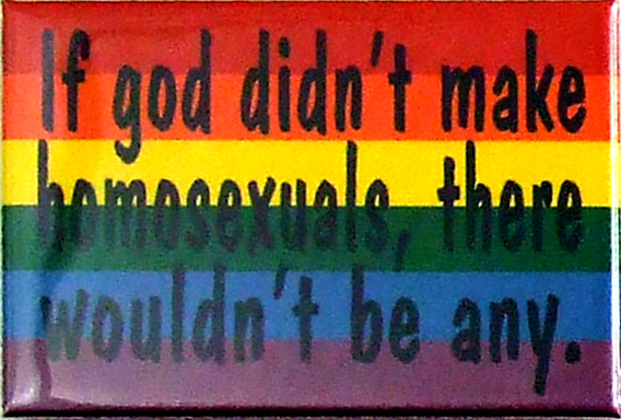 If god didn’t make homosexuals… Magnet. Vibrant colors. Metal with clear mylar coating magnet. 2 x 3″ or 5.08 x 7.62cm. By PHS International.