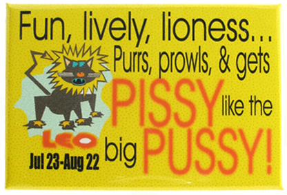 Fun, lively, lioness, purrs, prowls and gets pissy like a big pussy! Magnet. Vibrant colors. Metal with clear mylar coating magnet. 2 x 3″ or 5.08 x 7.62cm. By PHS International.