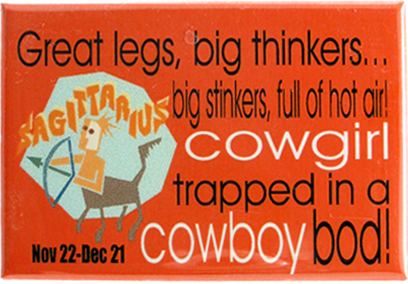 Great legs, big thinkers, full of air, Cowgirl trapped in a Cowgboy bod! Magnet. Vibrant colors. Metal with clear mylar coating magnet. 2 x 3″ or 5.08 x 7.62cm. By PHS International.