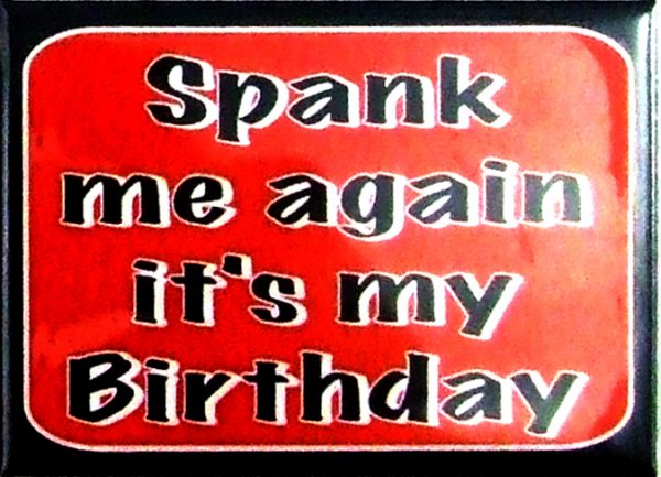 Spank Me Again It’s my Birthday Magnet. Vibrant colors. Metal with clear mylar coating magnet. 2 x 3″ or 5.08 x 7.62cm. By PHS International.