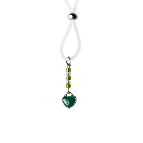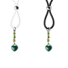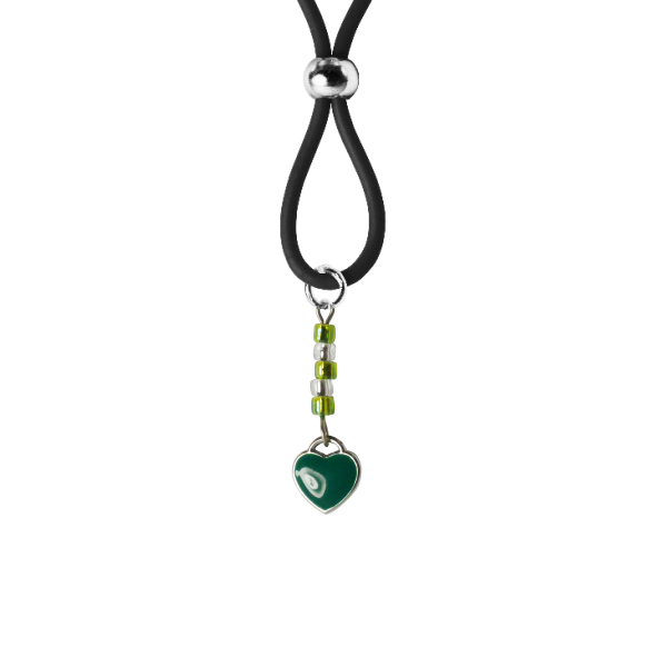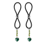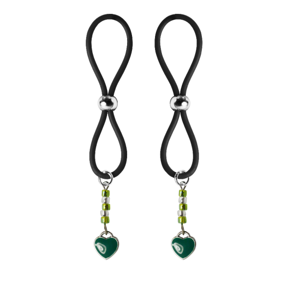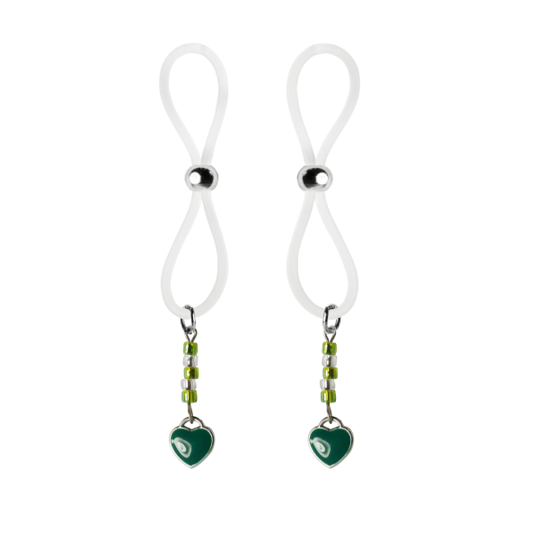 Our enamel and stainless steel silver heart charms on these lovely nipple lassos are both dainty and elegant. This pair in green enamel are accented with dazzling green and crystal clear seed beads. The black or clear silicone loops encircle your nipple and the silver bead is used to tighten the loop. Don’t you love finding new places to wear jewelry?