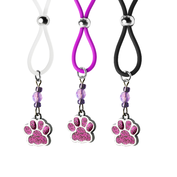Check out these “pawsatively” adorable nipple lassos decorated with little animal paw charms. This set in hot pink and silver are accented with lavender faceted beads and purple seed beads The purple, black or clear silicone loops encircle your nipple and the silver bead is used to tighten the loop. Don’t you love finding new places to wear jewelry?