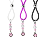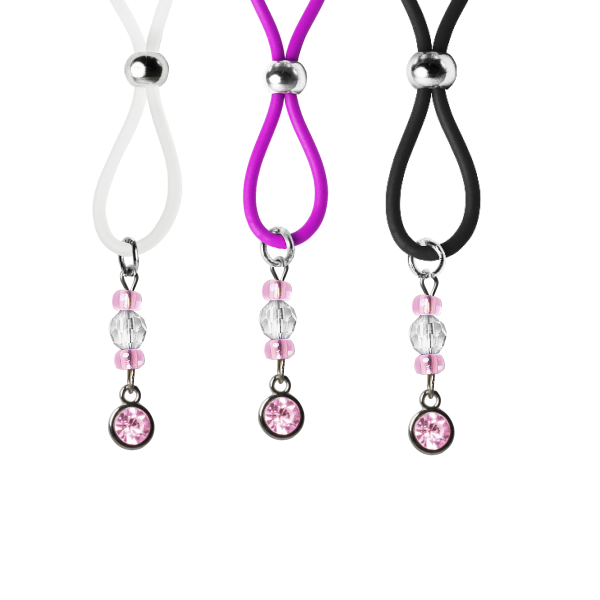Opal is the birthstone for October. These opal like nipple lassos are decorated with clear faceted beads & dazzling pink seed beads. The purple, black or clear silicone loops encircle your nipple and the silver bead is used to tighten the loop. Available in the birthstones of every month!