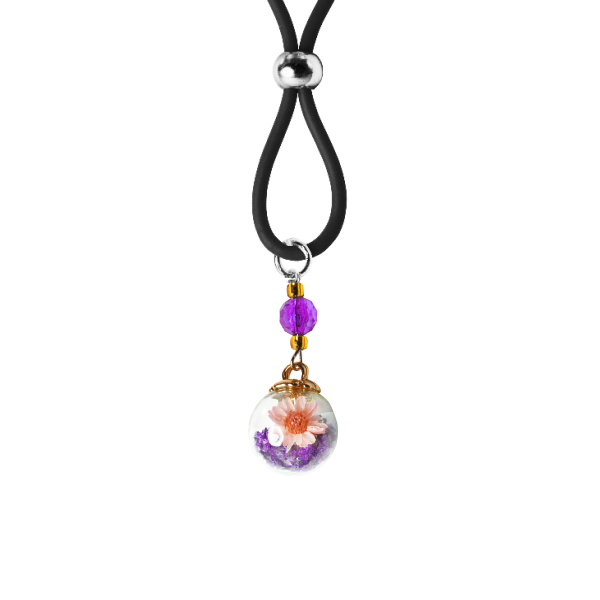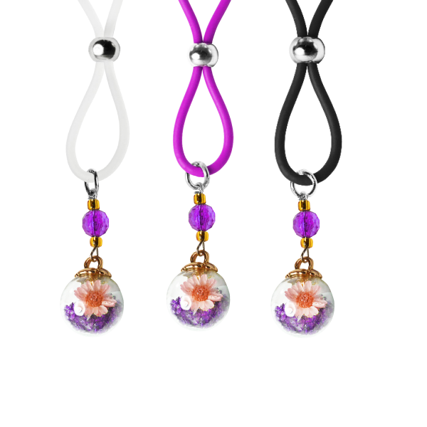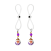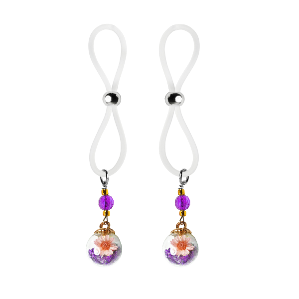 Inside the glass balls that hang on these adorable nipple lassos are small flowers and dozens of tiny purple colored seed beads. The gold caps on this purple version are accented with purple faceted beads and gold seed beads.The purple, black or clear silicone loops encircle your nipple and the large gold bead is used to tighten the loop. Don’t you love finding new places to wear jewelry?