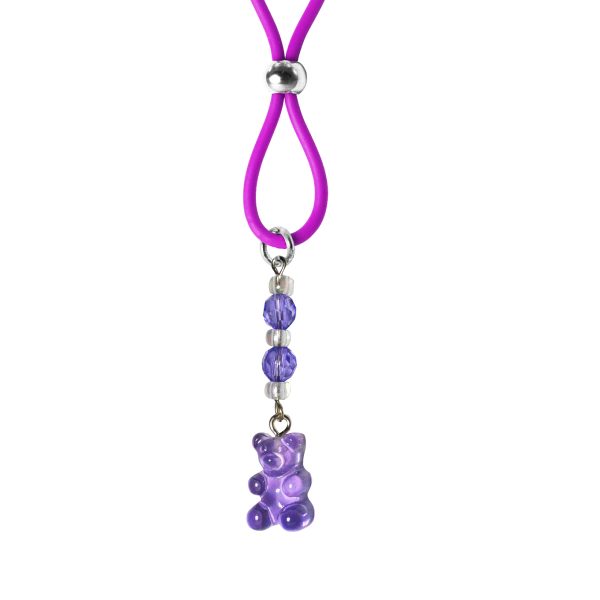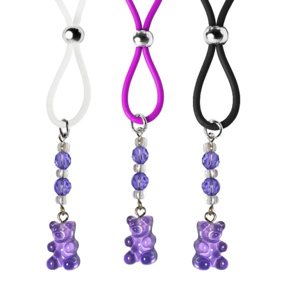 How adorable are these cute “Gummie” bear charms? This pair of purple gummies are accented with purple faceted beads and clear seed beads. Available on purple, clear or black silicone loops which encircle your nipple; then the silver slider bead is slide up to hold the loop in place. Collect all 6 colors.