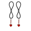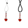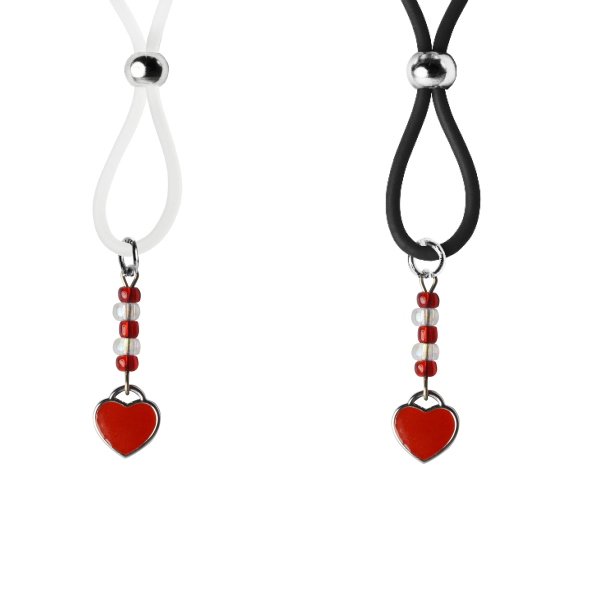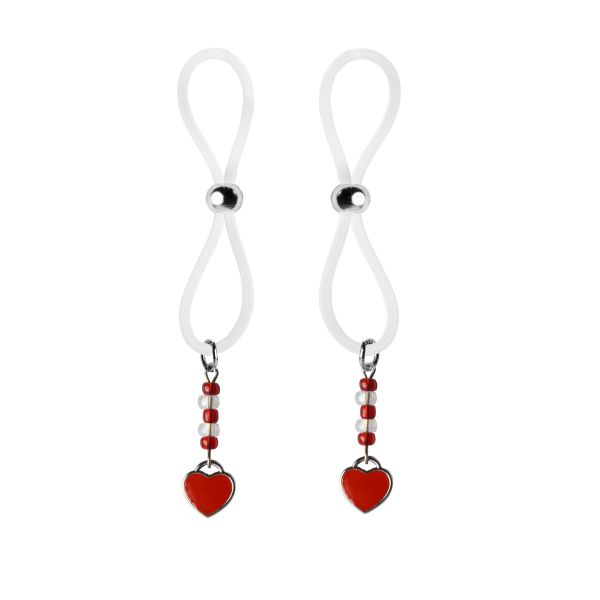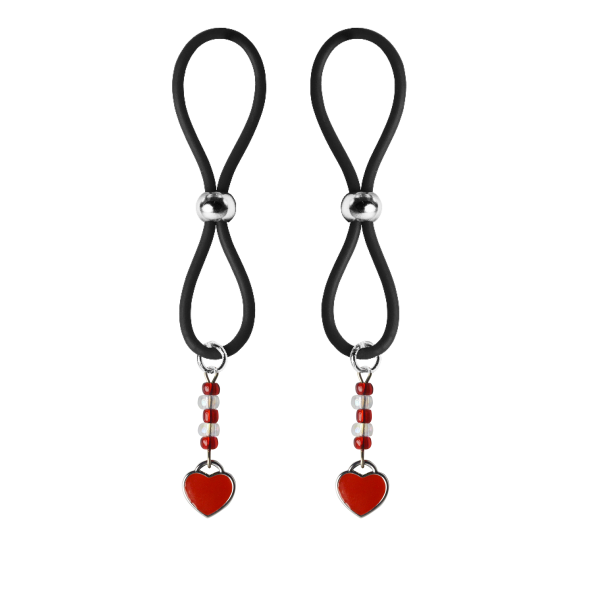 Our enamel and stainless steel silver heart charms on these lovely nipple lassos are both dainty and elegant. This pair in red enamel are accented with dazzling red and crystal clear seed beads. The black or clear silicone loops encircle your nipple and the silver bead is used to tighten the loop. Don’t you love finding new places to wear jewelry?