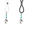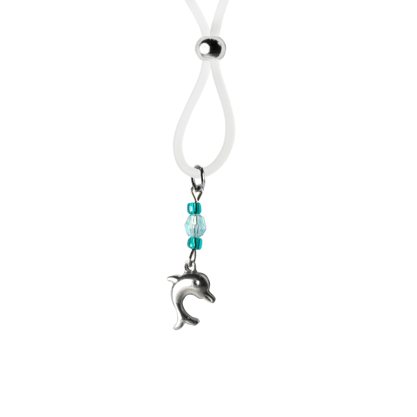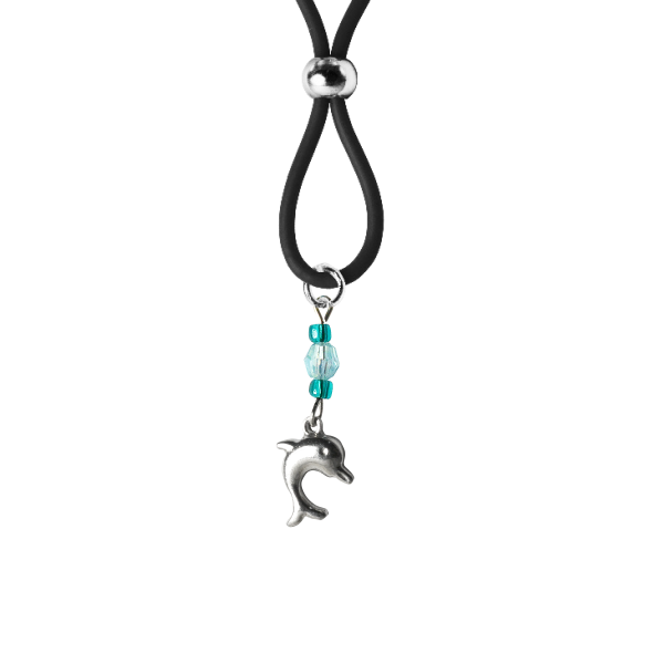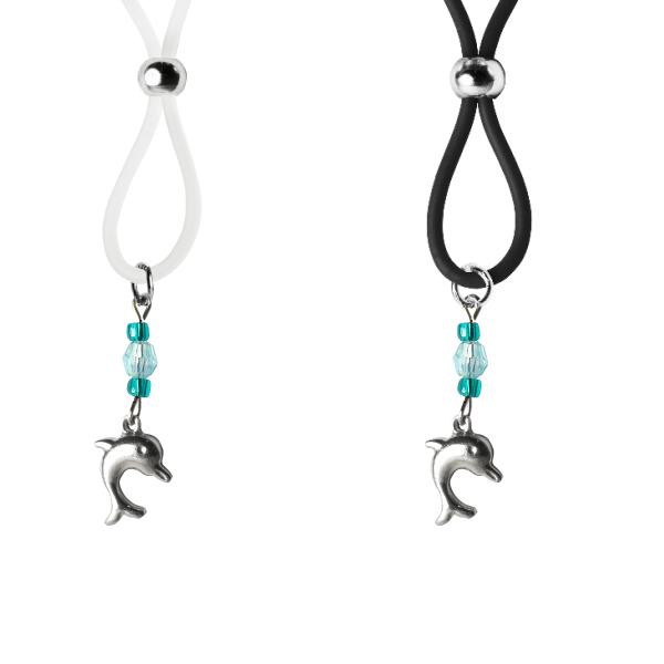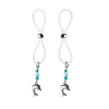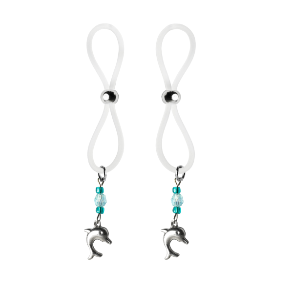 These wonderful nipple lassos are decorated with stainless steel dolphin charms and accented with blue faceted beads and aqua seed beads. The black or clear silicone loops encircle your nipple and the silver bead is used to tighten the loop. Don’t you love finding new places to wear jewelry?