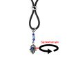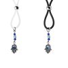 The eye in the palm of this stainless steel hand charm actually moves. Attached to black or clear silicone nipple lassos which are also decorated with light blue faceted beads and dark blue seed beads. The black or clear silicone loops encircle your nipple and the silver bead is used to tighten the loop.