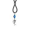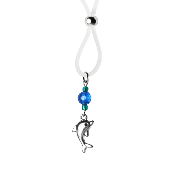 Our playful stainless steel dolphin charm is accented with aqua seed beads and a light blue faceted bead. Available on clear or black silicone loop with a stainless steel slider for great adjustability.