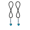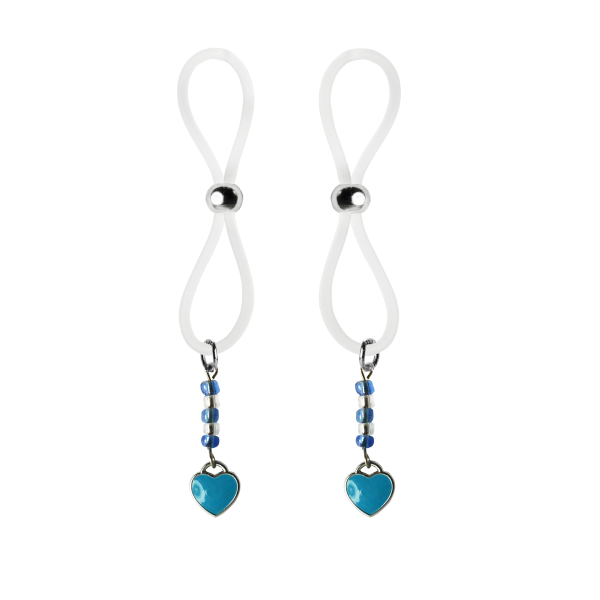 Our enamel and stainless steel silver heart charms on these lovely nipple lassos are both dainty and elegant. This pair in turquoise enamel are accented with dazzling turquoise and crystal clear seed beads. The black or clear silicone loops encircle your nipple and the silver bead is used to tighten the loop. Don’t you love finding new places to wear jewelry?