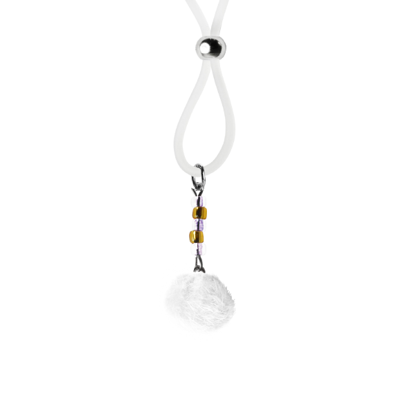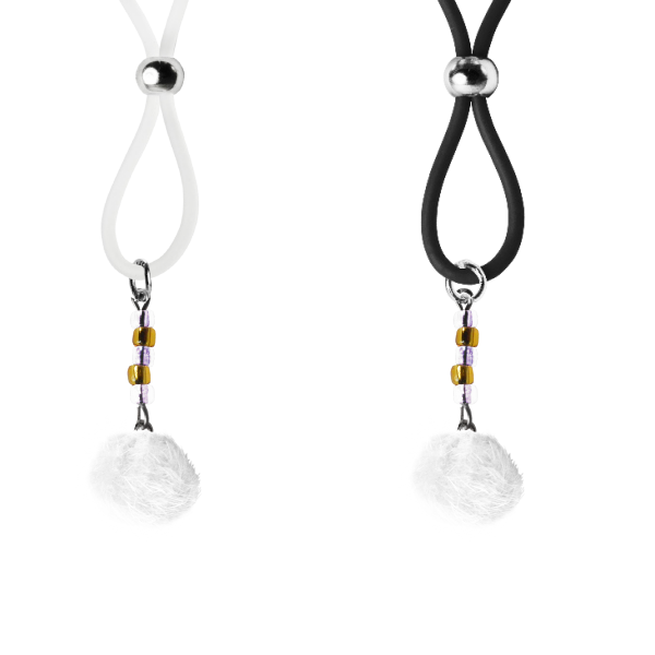 How fun are these? White fuzzy puff ball charms are featured on these adorable nipple lassos. Accented with dazzling gold and crystal clear seed beads these lassos will be noticed. The black or clear silicone loops encircle your nipple and the large gold bead is used to tighten the loop. Don’t you love finding new places to wear jewelry?