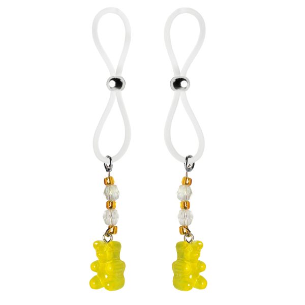 How adorable are these cute “Gummie” bear charms? This pair of yellow gummies are accented with clear faceted beads and gold seed beads. Available on clear or black silicone loops which encircle your nipple; then the silver slider bead is slide up to hold the loop in place. Collect all 6 colors.