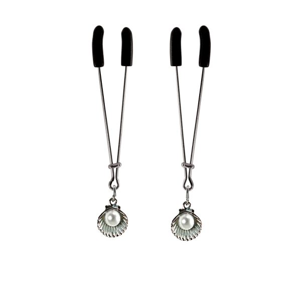 These charms feature lovely pearls in an open clamshell. The charms hang from gleaming chrome tweezer style nipple clamps. The tweezer clamps are fully adjustable by sliding the bar up or down. includes organza gift storage bag (color will be random)