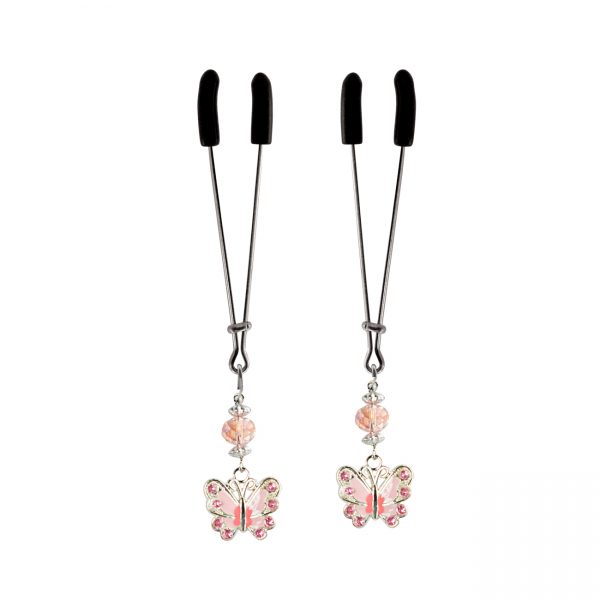 This lovely pink enamel butterfly charm features brilliant pink gems. A faceted pink bead adds a bit of bling. The tweezer clamps are fully adjustable by sliding the bar up or down. includes organza gift storage bag (color will be random)