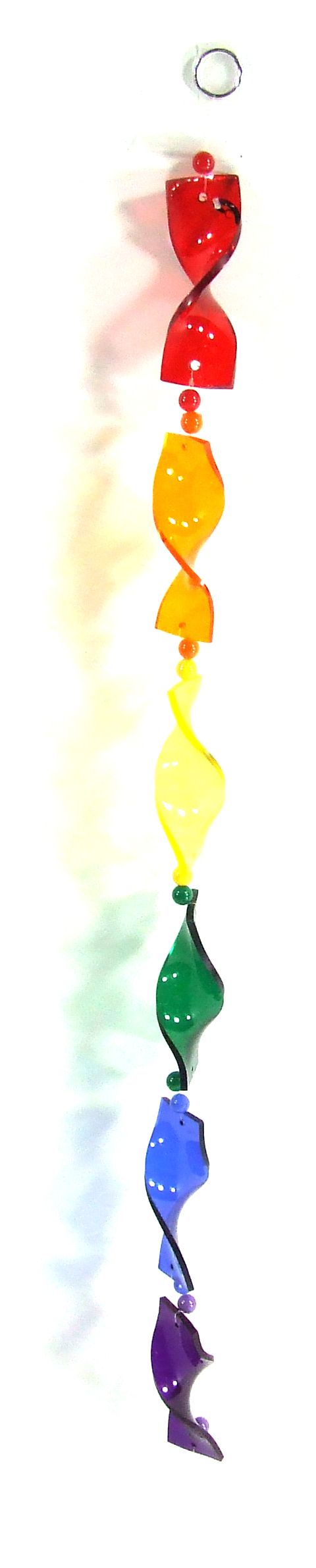 Check out this fabulous wind diva. Individual “bow ties” are connected with invisible string in the colors of the rainbow. Each piece spins on its own creating a really fun wind piece. A full 18″ long and fabricated in bright rainbow colors, this is one o