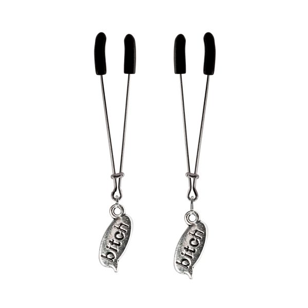 Check out these funny silver bitch charm nipple clamps. The tweezer clamp is fully adjustable by sliding the bar up or down. includes organza gift storage bag (color will be random)