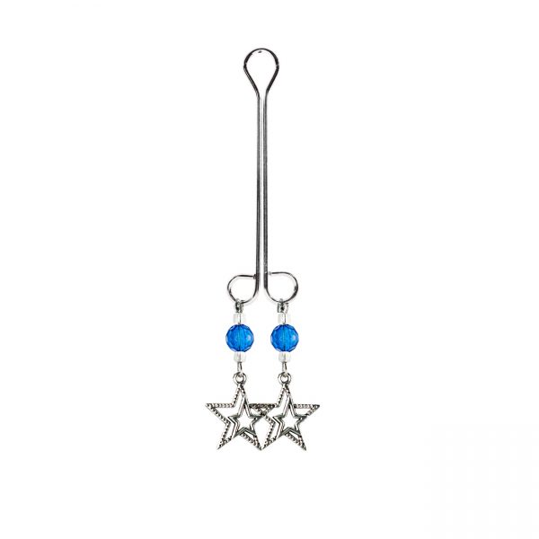 Very stylish silver colored double star charms charms are featured on this double loop “Cleopatra” style clit clamp. Sparkling blue faceted beads add a bit of blingThe clamp is worn by pulling the two loops apart and placing one on each side of the clitoris. includes organza gift storage bag (color will be random) A clit clamp is a simple sex toy designed to gently squeeze the clitoris and provide thrilling arousal without vibrations. Clit clamps are gentle sex toys designed to enhance female sexual pleasure.