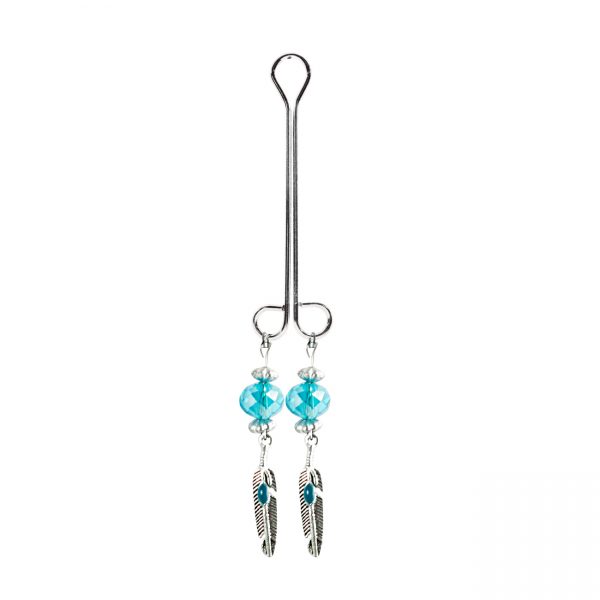 These silver colored feather charms feature a pretty blue accent in the center; they hang on as double loop “Cleopatra” style clit clamp. A light blue facted bead adds some sparkle. The clamp is worn by pulling the two loops apart and placing one on each side of the clitoris. includes organza gift storage bag (color will be random) A clit clamp is a simple sex toy designed to gently squeeze the clitoris and provide thrilling arousal without vibrations. Clit clamps are gentle sex toys designed to enhance female sexual pleasure.
