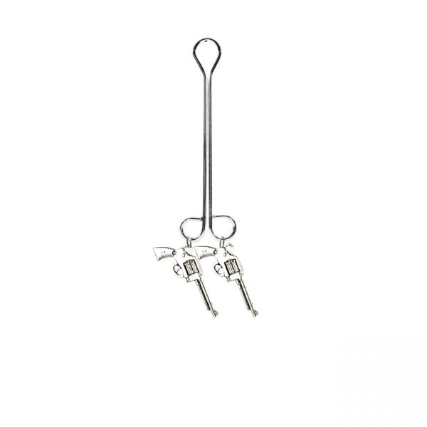 Show off your inner outlaw by wearing this double loop “Cleopatra” style clit clamp with a pair of cool six shooter gun charms. The clamp is worn by pulling the two loops apart and placing one on each side of the clitoris. includes organza gift storage bag (color will be random) A clit clamp is a simple sex toy designed to gently squeeze the clitoris and provide thrilling arousal without vibrations. Clit clamps are gentle sex toys designed to enhance female sexual pleasure.