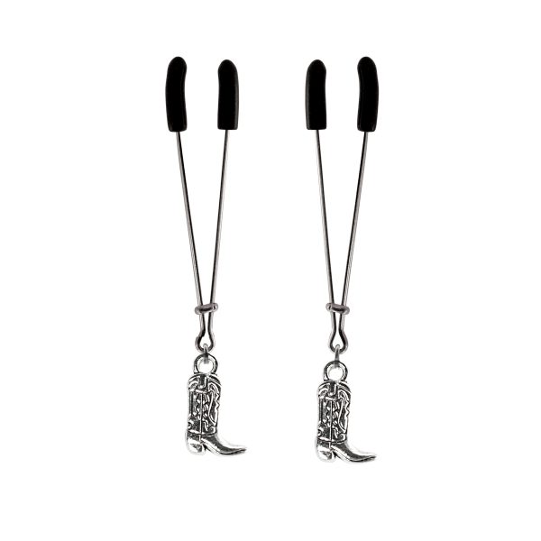 Check out the cute cowboy boot charms that decorate these gleaming chrome tweezer style nipple clamps. The tweezer clamps are fully adjustable by sliding the bar up or down. includes organza gift storage bag (color will be random)