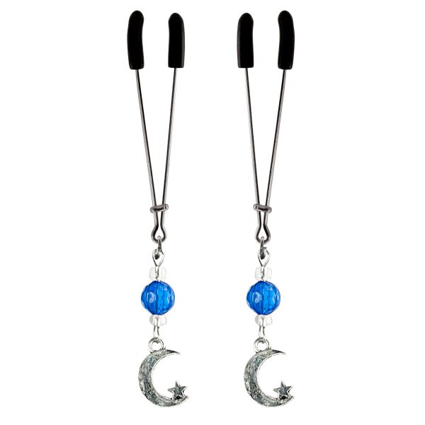 Classic moon & star silver colored charms are featured on these gleaming chrome tweezer style nipple clamps. Blue & clear faceted beads add sparkle. The tweezer clamps are fully adjustable by sliding the bar up or down. includes organza gift storage bag (color will be random)