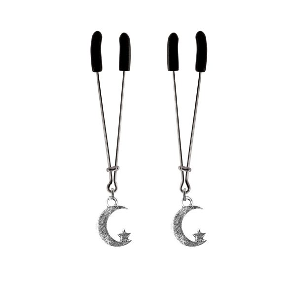 Classic moon & star silver colored charms are featured on these gleaming chrome tweezer style nipple clamps clamp.. The tweezer clamps are fully adjustable by sliding the bar up or down. includes organza gift storage bag (color will be random)