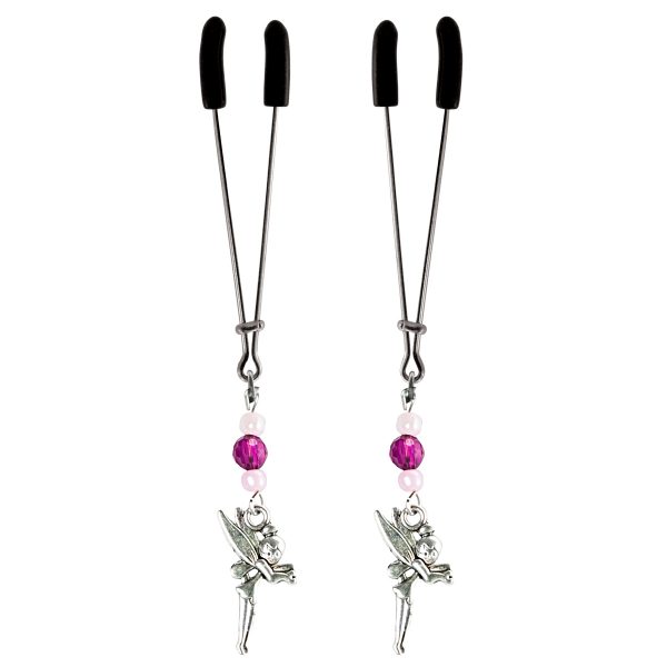 Do you believe in fairies? Dainty tinkerbell fairy charms decorate these gleaming chrome tweezer style nipple clamps. The tweezer clamps are fully adjustable by sliding the bar up or down. includes organza gift storage bag (color will be random)