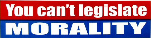 Can’t legislate moral Sticker. UV resistant colors on white vinyl background. Good for indoor and outdoor use. Adhesive on the back. 2.5 x 9.25″ or 6.4 x 23.5cm