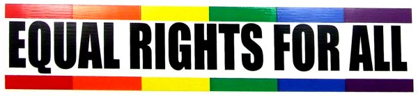 Equal Rights For All Sticker. Vibrant double rainbow strips in UV resistant colors on a white vinyl background. Good for indoor and outdoor use. Adhesive on the back. 1.5 x 8″ or 3.8 x 20.3cm