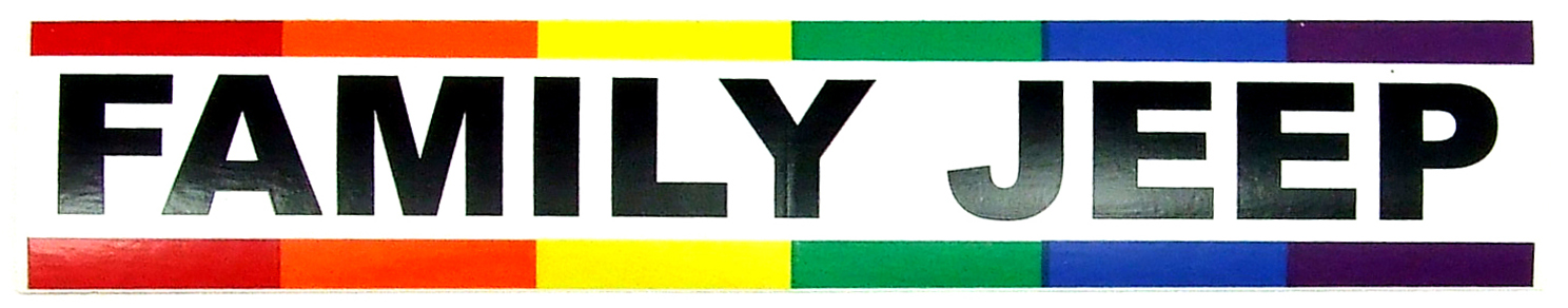 Family Jeep Sticker. Vibrant double rainbow strips in UV resistant colors on a white vinyl background. Good for indoor and outdoor use. Adhesive on the back. 1.5 x 8″ or 3.8 x 20.3cm