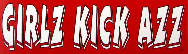 Girlz Kick Azz Sticker. UV resistant colors on white vinyl background. Good for indoor and outdoor use. Adhesive on the back. 3 x 11.5″ or 7.6 x 29.2cm