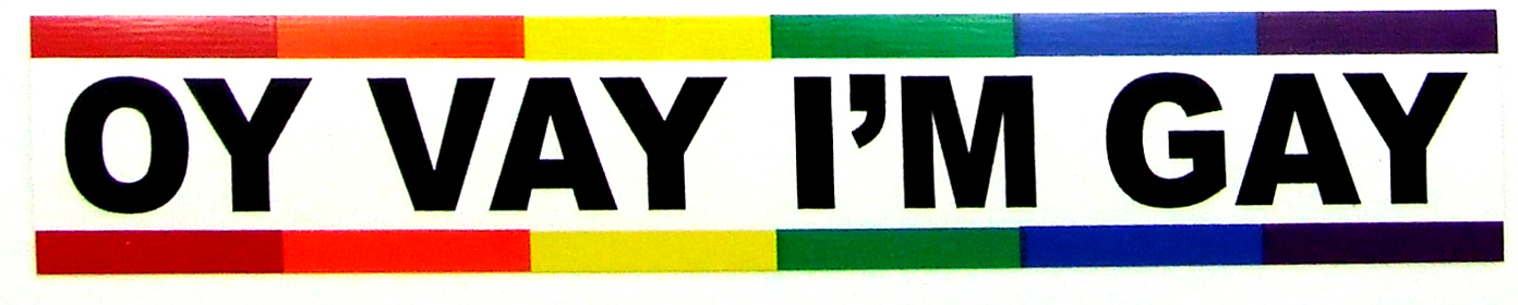 Oy Vay I’m Gay Sticker. Vibrant double rainbow strips in UV resistant colors on a white vinyl background. Good for indoor and outdoor use. Adhesive on the back. 1.5 x 8″ or 3.8 x 20.3cm