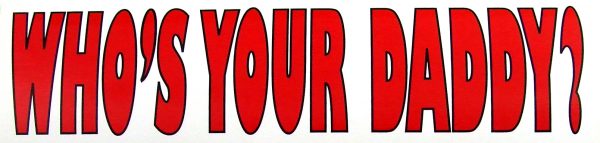 Who’s Your Daddy Sticker. UV resistant colors on white vinyl background. Good for indoor and outdoor use. Adhesive on the back. 2.5 x 9.25″ or 6.4 x 23.5cm