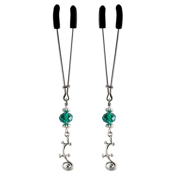 Check out this stylish gecko charms hanging on these gleaming chrome tweezer style nipple clamps. The green faceted beads add a bit of bling. The tweezer clamps are fully adjustable by sliding the bar up or down. includes organza gift storage bag (color will be random)